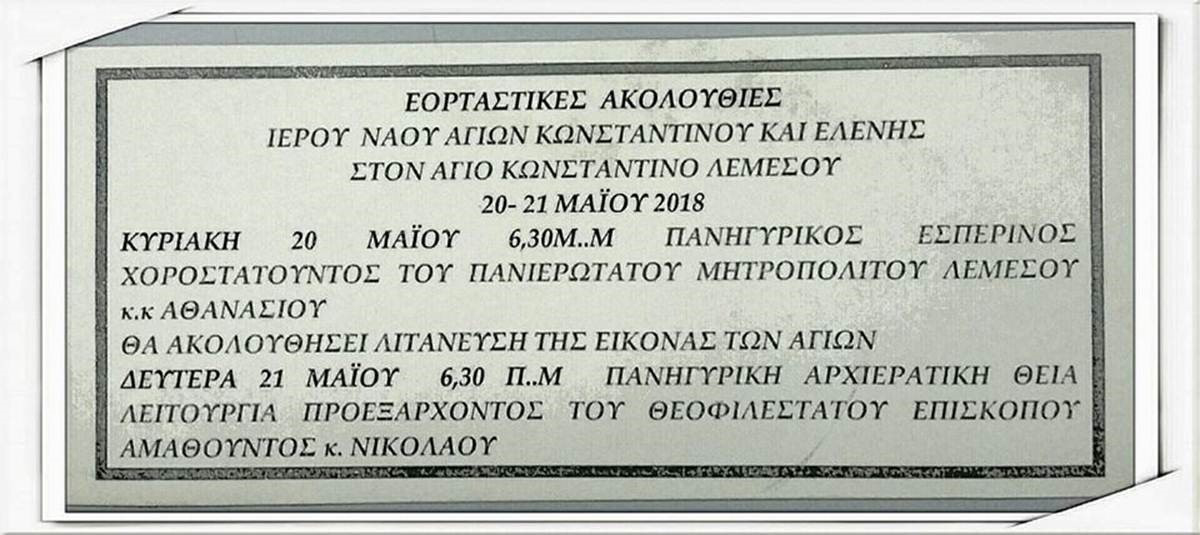 Ο Ιερός Ναός Αγίων Κωνσταντίνου και Ελένης της κοινότητος Αγίου Κωνσταντίνου Λεμεσού ανακοινώνει ότι επί τη εορτή των Αγίων ενδόξων Θεοστέπτων Βασιλέων και Ισαποστόλων Κωνσταντίνου και Ελένης θα τελεσθούν στο Ναό μας οι πιο κάτω πανηγυρικές και εορταστικές ακολουθίες:
