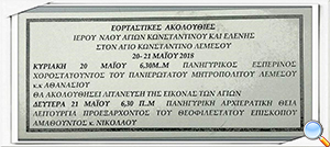 Ο Ιερός Ναός Αγίων Κωνσταντίνου και Ελένης της κοινότητος Αγίου Κωνσταντίνου Λεμεσού ανακοινώνει ότι επί τη εορτή των Αγίων ενδόξων Θεοστέπτων Βασιλέων και Ισαποστόλων Κωνσταντίνου και Ελένης θα τελεσθούν στο Ναό μας οι πιο κάτω πανηγυρικές και εορταστικές ακολουθίες:
